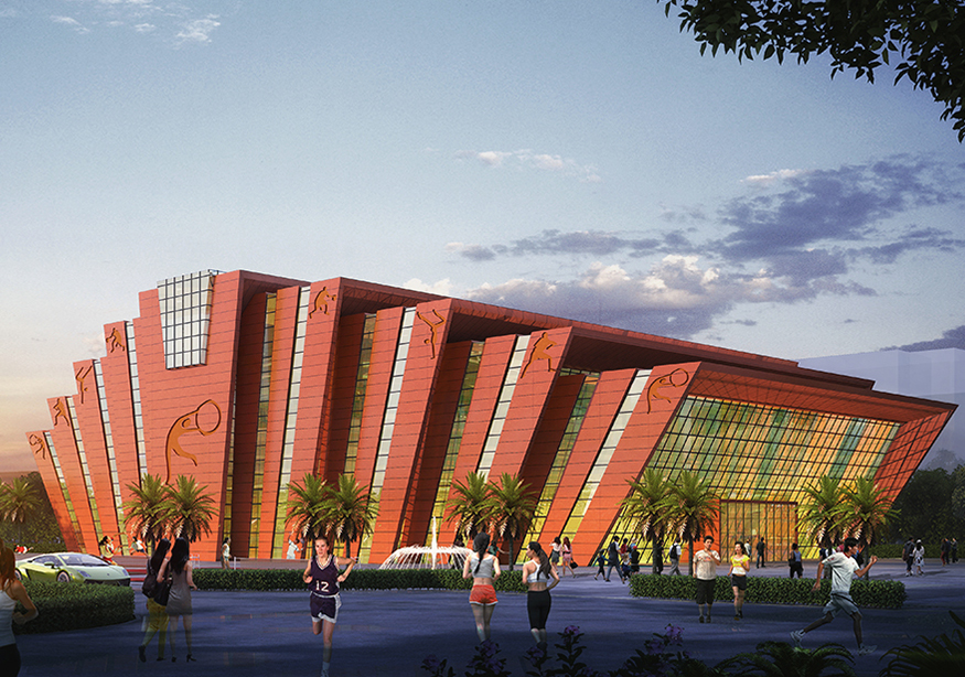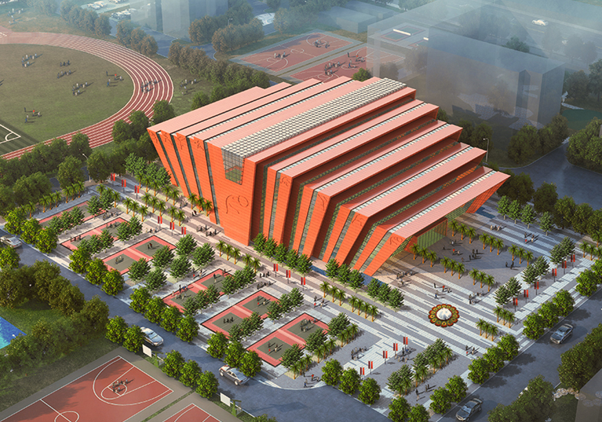 原學(xué)校顏色以灰白色為主要色調(diào),中學(xué)是一個(gè)年輕人集聚的場所是一群有朝氣,活潑的祖國未來的花朵。紅色代表著熱量、活力與意志力。因此體育館設(shè)計(jì)采用紅色作為主要色調(diào)。符合體育館的建筑性格。點(diǎn)綴整個(gè)校園,點(diǎn)燃學(xué)生的激情。